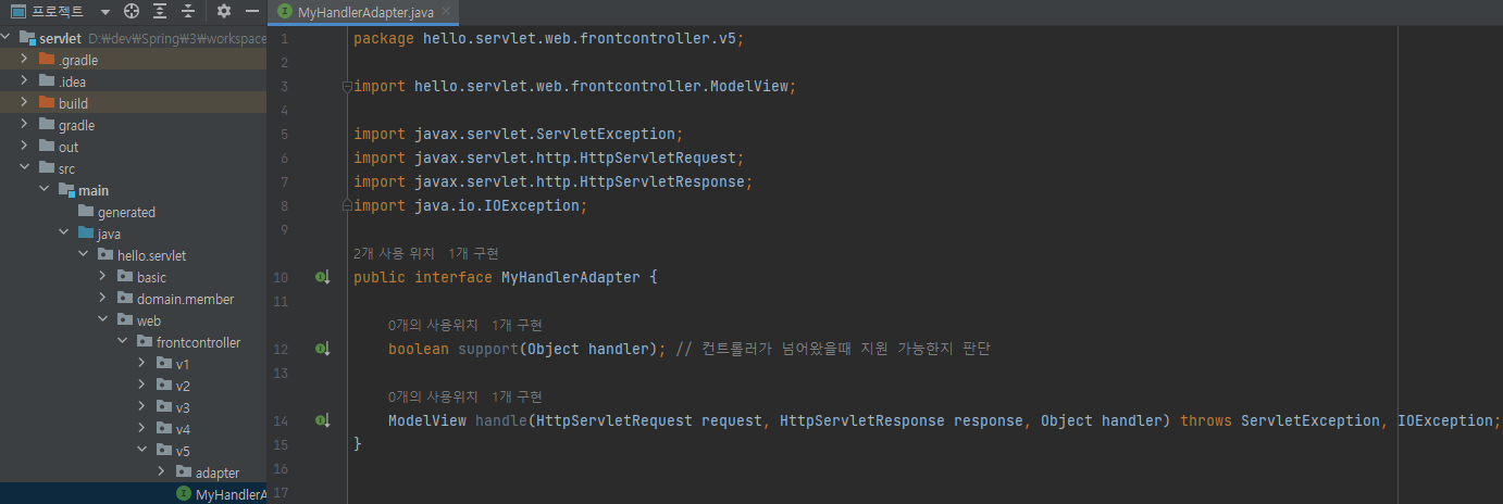 public interface ControllerV4 { String process(Map<String, String> paramMap, Map<String, Object> model); } public interface MyHandlerAdapter { ModelView handle(HttpServletRequest request, HttpServletResponse response, Object handler) throws ServletException, IOException; }FrontControllerServletV5
