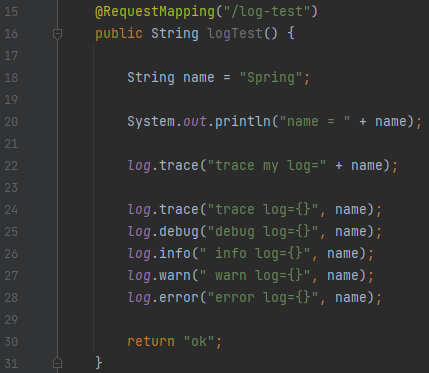 package hello.springmvc.basic; import org.slf4j.Logger; import org.slf4j.LoggerFactory; import org.springframework.web.bind.annotation.RequestMapping; import org.springframework.web.bind.annotation.RestController; @RestController public class LogTestController { // slf4j private final Logger log = LoggerFactory.getLogger(getClass()); @RequestMapping("/log-test") public String logTest() { String name = "Spring"; System.out.println("name = " + name); log.trace("trace log={}", name); log.debug("debug log={}", name); log.info(" info log={}", name); log.warn(" warn log={}", name); log.error("error log={}", name); return "ok"; } }