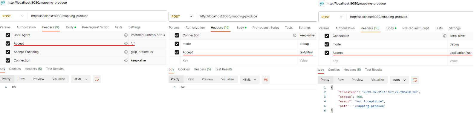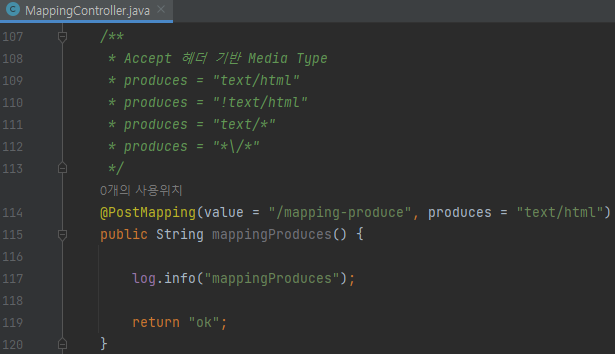 /** * Accept 헤더 기반 Media Type * produces = "text/html" * produces = "!text/html" * produces = "text/*" * produces = "*\/*" */ @PostMapping(value = "/mapping-produce", produces = "text/html") public String mappingProduces() { log.info("mappingProduces"); return "ok"; }