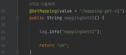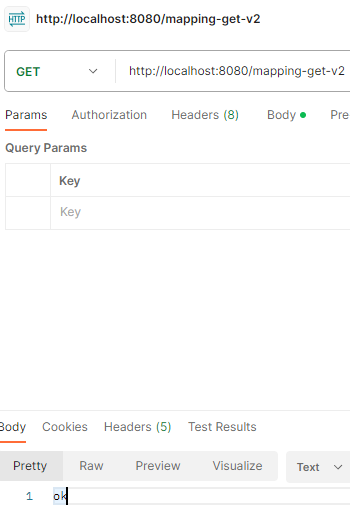 @GetMapping(value = "/mapping-get-v2") public String mappingGetV2() { log.info("mappingGetV2"); return "ok"; }