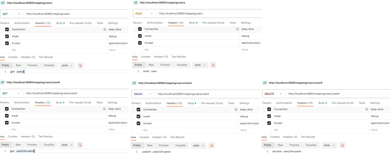 package hello.springmvc.basic.requestmapping; import org.springframework.web.bind.annotation.*; @RestController @RequestMapping("/mapping/users") public class MappingClassController { /** * 회원 목록 조회 : GET /mapping/users * 회원 등록 : POST /mapping/users * 회원 조회 : GET /mapping/users/{userId} * 회원 수정 : PATCH /mapping/users/{userId} * 회원 삭제 : DELETE /mapping/users/{userId} */ @GetMapping public String user() { return "get users"; } @PostMapping public String addUser() { return "post user"; } @GetMapping("/{userId}") public String findUser(@PathVariable String userId) { return "get userId=" + userId; } @PatchMapping("/{userId}") public String updateUser(@PathVariable String userId) { return "update userId=" + userId; } @DeleteMapping("/{userId}") public String deleteUser(@PathVariable String userId) { return "delete userId=" + userId; } }