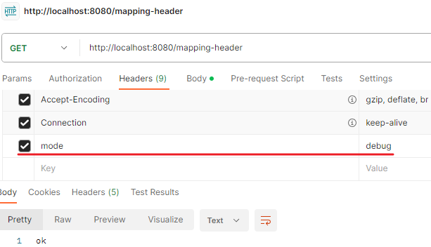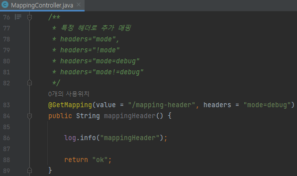 /** * 특정 헤더로 추가 매핑 * headers="mode", * headers="!mode" * headers="mode=debug" * headers="mode!=debug" */ @GetMapping(value = "/mapping-header", headers = "mode=debug") public String mappingHeader() { log.info("mappingHeader"); return "ok"; }