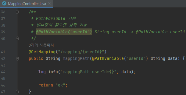 /** * PathVariable 사용 * 변수명이 같으면 생략 가능 * @PathVariable("userId") String userId -> @PathVariable userId */ @GetMapping("/mapping/{userId}") public String mappingPath(@PathVariable("userId") String data) { log.info("mappingPath userId={}", data); return "ok"; }