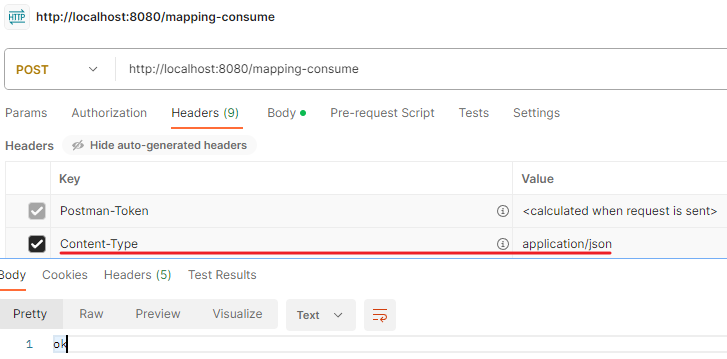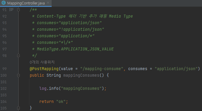 /** * Content-Type 헤더 기반 추가 매핑 Media Type * consumes="application/json" * consumes="!application/json" * consumes="application/*" * consumes="*\/*" * MediaType.APPLICATION_JSON_VALUE */ @PostMapping(value = "/mapping-consume", consumes = "application/json") public String mappingConsumes() { log.info("mappingConsumes"); return "ok"; }