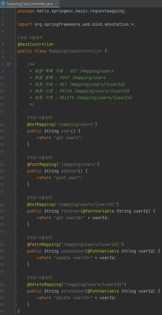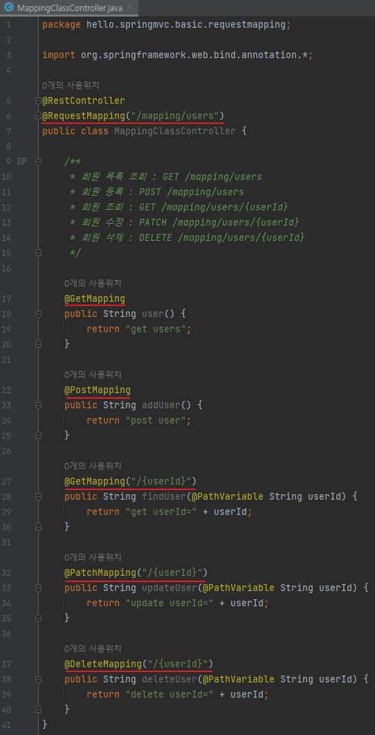 중복으로 사용되는 "/mapping/users"을 공통으로 처리하도록 @RequestMapping("/mapping/users") 추가