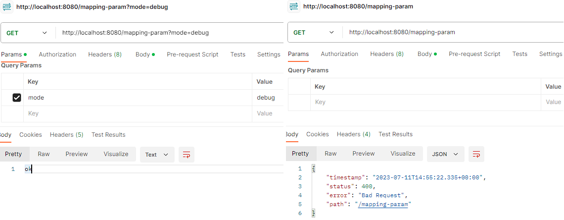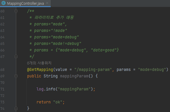 /** * 파라미터로 추가 매핑 * params="mode", * params="!mode" * params="mode=debug" * params="mode!=debug" * params = {"mode=debug", "data=good"} */ @GetMapping(value = "/mapping-param", params = "mode=debug") public String mappingParam() { log.info("mappingParam"); return "ok"; }