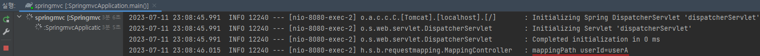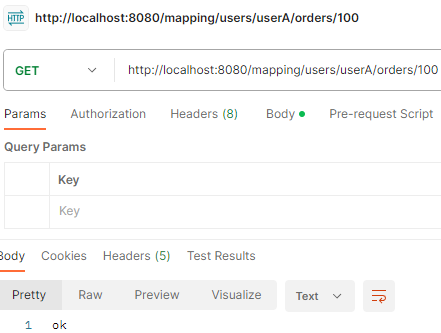 /** * PathVariable 사용 다중 */ @GetMapping("/mapping/users/{userId}/orders/{orderId}") public String mappingPath(@PathVariable String userId, @PathVariable Long orderId) { log.info("mappingPath userId={}, orderId={}", userId, orderId); return "ok"; }