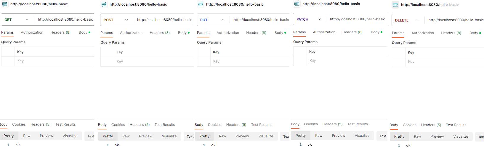 package hello.springmvc.basic.requestmapping; import org.slf4j.Logger; import org.slf4j.LoggerFactory; import org.springframework.web.bind.annotation.RequestMapping; import org.springframework.web.bind.annotation.RestController; @RestController public class MappingController { private Logger log = LoggerFactory.getLogger(getClass()); @RequestMapping("/hello-basic") public String helloBasic() { log.info("helloBasic"); return "ok"; } }