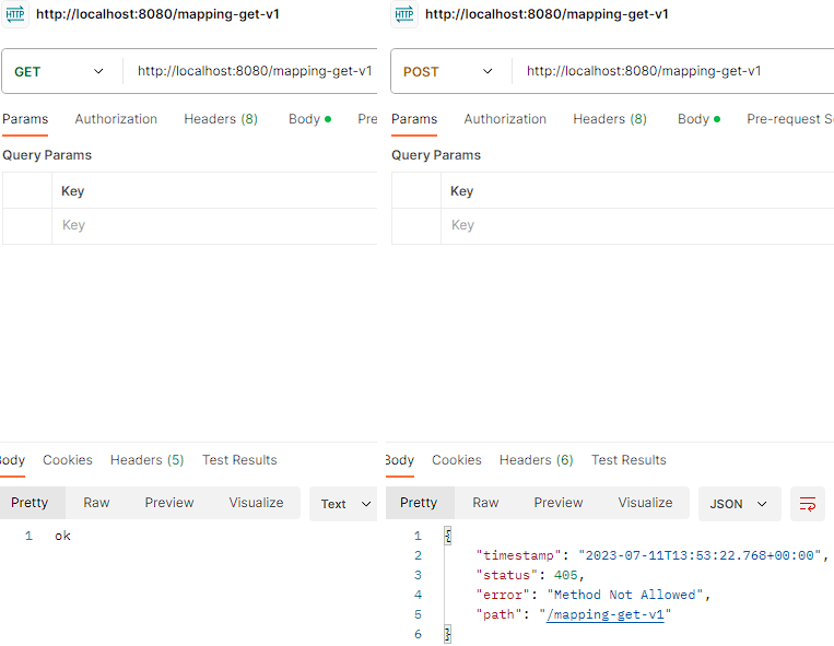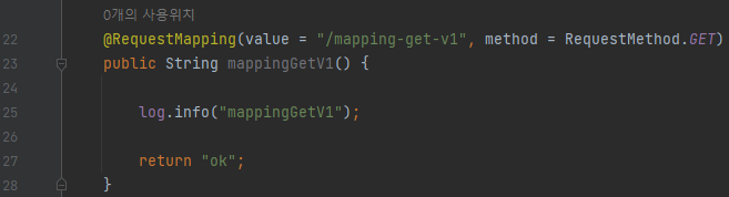 @RequestMapping(value = "/mapping-get-v1", method = RequestMethod.GET) public String mappingGetV1() { log.info("mappingGetV1"); return "ok"; }