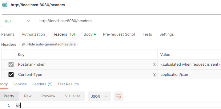package hello.springmvc.basic.request; import lombok.extern.slf4j.Slf4j; import org.springframework.http.HttpMethod; import org.springframework.util.MultiValueMap; import org.springframework.web.bind.annotation.CookieValue; import org.springframework.web.bind.annotation.RequestHeader; import org.springframework.web.bind.annotation.RequestMapping; import org.springframework.web.bind.annotation.RestController; import javax.servlet.http.HttpServletRequest; import javax.servlet.http.HttpServletResponse; import java.util.Locale; @Slf4j @RestController public class RequestHeaderController { @RequestMapping("/headers") public String headers(HttpServletRequest request, HttpServletResponse response, HttpMethod httpMethod, Locale locale, @RequestHeader MultiValueMap<String, String> headerMap, @RequestHeader("host") String host, @CookieValue(value = "myCookie", required = false) String cookie ) { log.info("request={}", request); log.info("response={}", response); log.info("httpMethod={}", httpMethod); log.info("locale={}", locale); log.info("headerMap={}", headerMap); log.info("header host={}", host); log.info("myCookie={}", cookie); return "ok"; } }