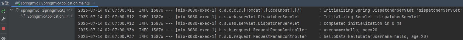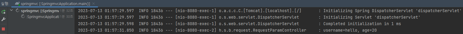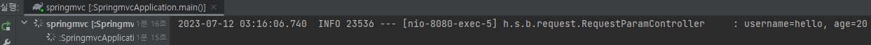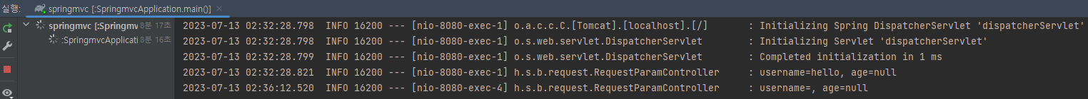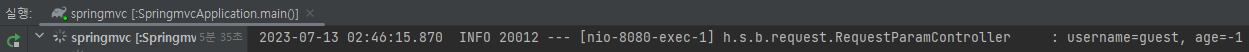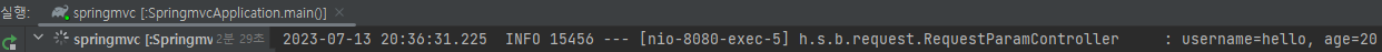 /** * @RequestParam 사용 * HTTP 파라미터 이름이 변수 이름과 같으면 @RequestParam(name="xx") 생략 가능 */ @ResponseBody @RequestMapping("/request-param-v3") public String requestParamV3(@RequestParam String username, @RequestParam int age){ log.info("username={}, age={}", username, age); return "ok"; }