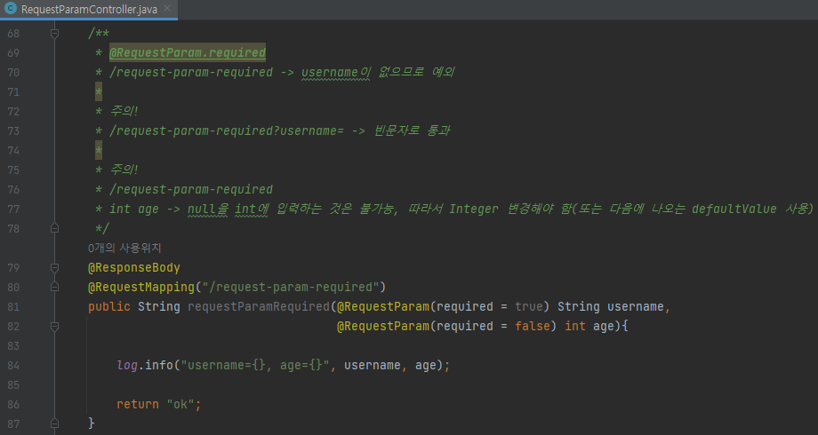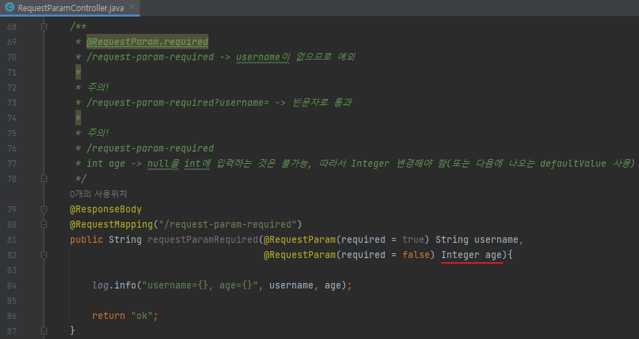 /** * @RequestParam.required * /request-param-required -> username이 없으므로 예외 * * 주의! * /request-param-required?username= -> 빈문자로 통과 * * 주의! * /request-param-required * int age -> null을 int에 입력하는 것은 불가능, 따라서 Integer 변경해야 함(또는 다음에 나오는 defaultValue 사용) */ @ResponseBody @RequestMapping("/request-param-required") public String requestParamRequired(@RequestParam(required = true) String username, @RequestParam(required = false) Integer age){ log.info("username={}, age={}", username, age); return "ok"; }