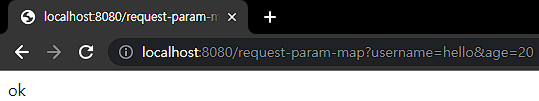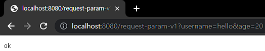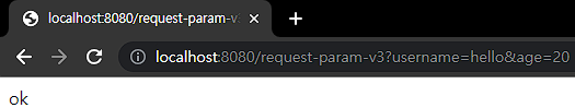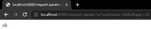 /** * @RequestParam 사용 * - 파라미터 이름으로 바인딩 * @ResponseBody 추가 * - View 조회를 무시하고, HTTP message body에 직접 해당 내용 입력 */ @ResponseBody @RequestMapping("/request-param-v2") public String requestParamV2(@RequestParam("username") String memberName, @RequestParam("age") int memberAge){ log.info("username={}, age={}", memberName, memberAge); return "ok"; }