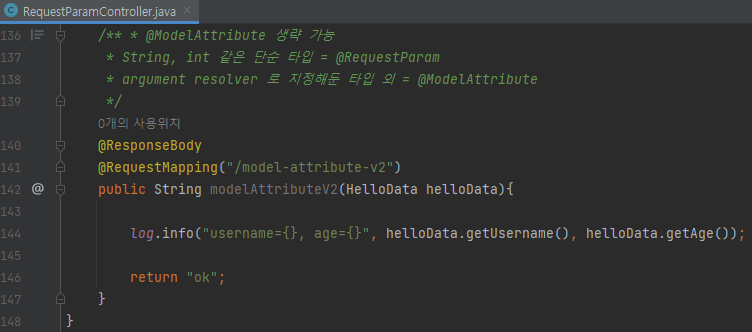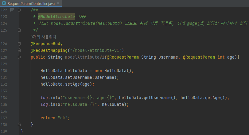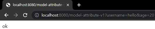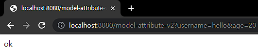 /** * @ModelAttribute 사용 * 참고: model.addAttribute(helloData) 코드도 함께 자동 적용됨, 뒤에 model을 설명할 때자세히 설명 */ @ResponseBody @RequestMapping("/model-attribute-v1") public String modelAttributeV1(@RequestParam String username, @RequestParam int age){ HelloData helloData = new HelloData(); helloData.setUsername(username); helloData.setAge(age); log.info("username={}, age={}", helloData.getUsername(), helloData.getAge()); log.info("helloData={}", helloData); return "ok"; }