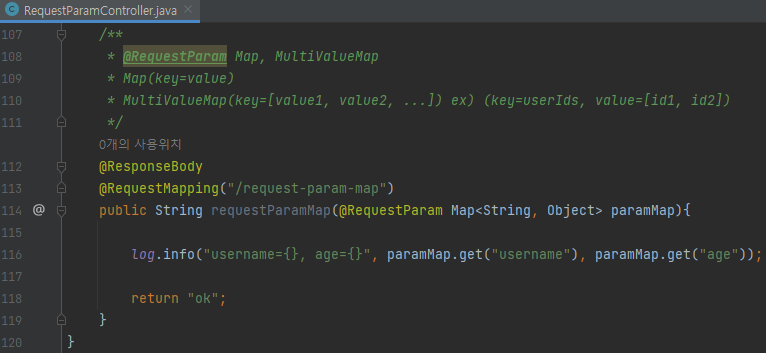 /** * @RequestParam Map, MultiValueMap * Map(key=value) * MultiValueMap(key=[value1, value2, ...]) ex) (key=userIds, value=[id1, id2]) */ @ResponseBody @RequestMapping("/request-param-map") public String requestParamMap(@RequestParam Map<String, Object> paramMap){ log.info("username={}, age={}", paramMap.get("username"), paramMap.get("age")); return "ok"; }