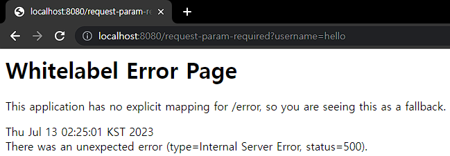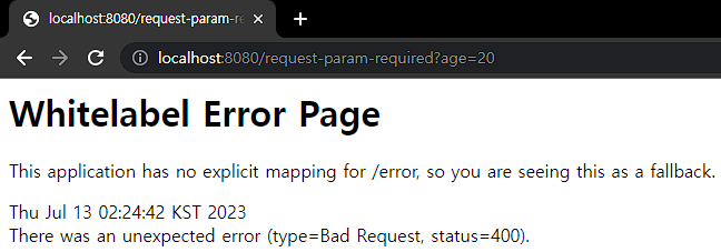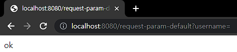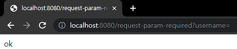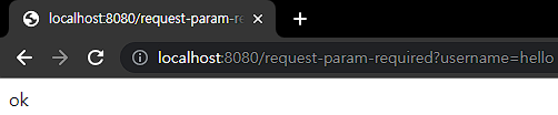 /** * @RequestParam.required * /request-param-required -> username이 없으므로 예외 * * 주의! * /request-param-required?username= -> 빈문자로 통과 * * 주의! * /request-param-required * int age -> null을 int에 입력하는 것은 불가능, 따라서 Integer 변경해야 함(또는 다음에 나오는 defaultValue 사용) */ @ResponseBody @RequestMapping("/request-param-required") public String requestParamRequired(@RequestParam(required = true) String username, @RequestParam(required = false) int age){ log.info("username={}, age={}", username, age); return "ok"; }