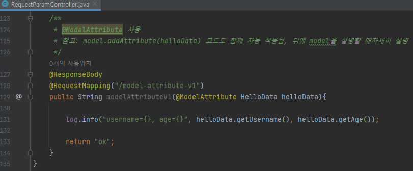 /** * @ModelAttribute 사용 * 참고: model.addAttribute(helloData) 코드도 함께 자동 적용됨, 뒤에 model을 설명할 때자세히 설명 */ @ResponseBody @RequestMapping("/model-attribute-v1") public String modelAttributeV1(@ModelAttribute HelloData helloData){ log.info("username={}, age={}", helloData.getUsername(), helloData.getAge()); return "ok"; }