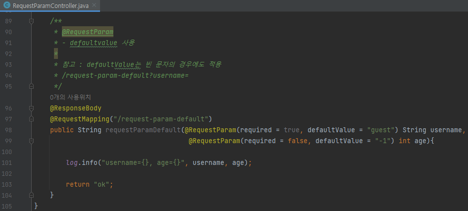 /** * @RequestParam * - defaultvalue 사용 * * 참고 : defaultValue는 빈 문자의 경우에도 적용 * /request-param-default?username= */ @ResponseBody @RequestMapping("/request-param-default") public String requestParamDefault(@RequestParam(required = true, defaultValue = "guest") String username, @RequestParam(required = false, defaultValue = "-1") int age){ log.info("username={}, age={}", username, age); return "ok"; }