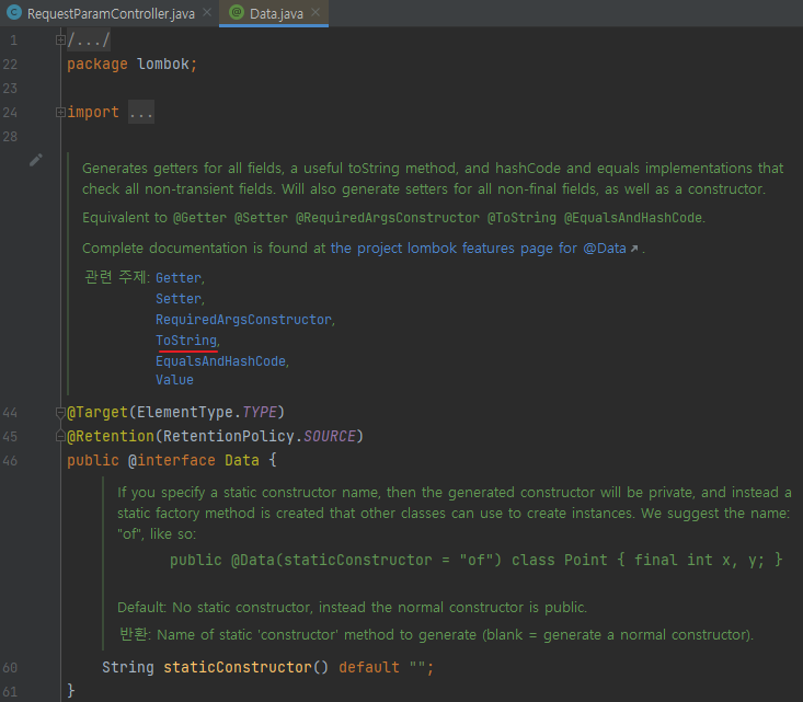 - @Getter , @Setter , @ToString , @EqualsAndHashCode , @RequiredArgsConstructor를 자동으로 적용해 준다.