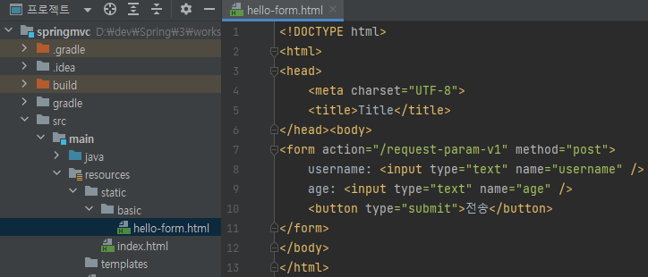 <!DOCTYPE html> <html> <head> <meta charset="UTF-8"> <title>Title</title> </head><body> <form action="/request-param-v1" method="post"> username: <input type="text" name="username" /> age: <input type="text" name="age" /> <button type="submit">전송</button> </form> </body> </html>