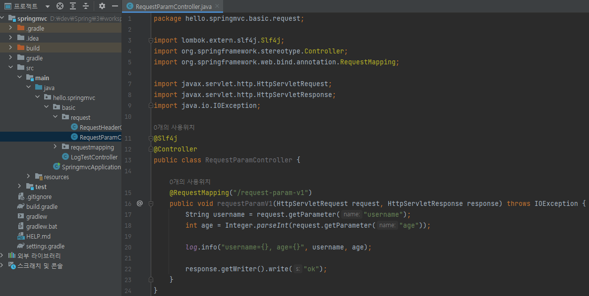 main/java/hello/springmvc/basic/request/RequestParamController 생성