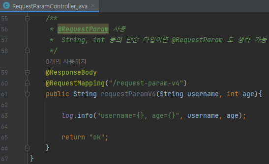/** * @RequestParam 사용 * String, int 등의 단순 타입이면 @RequestParam 도 생략 가능 */ @ResponseBody @RequestMapping("/request-param-v4") public String requestParamV4(String username, int age){ log.info("username={}, age={}", username, age); return "ok"; }