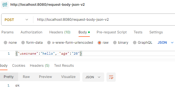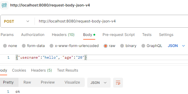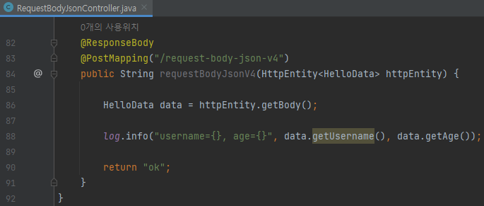 @ResponseBody @PostMapping("/request-body-json-v4") public String requestBodyJsonV4(HttpEntity<HelloData> httpEntity) { HelloData data = httpEntity.getBody(); log.info("username={}, age={}", data.getUsername(), data.getAge()); return "ok"; }