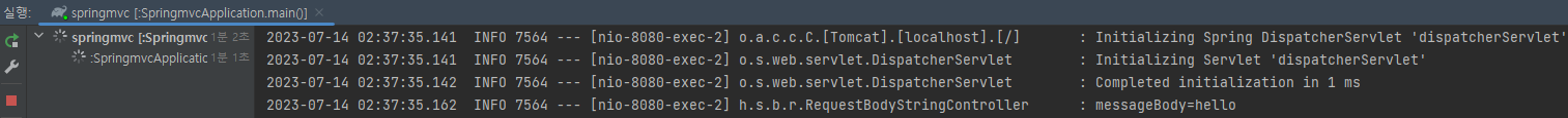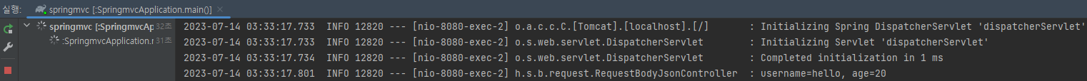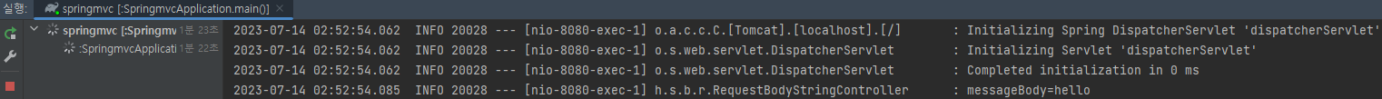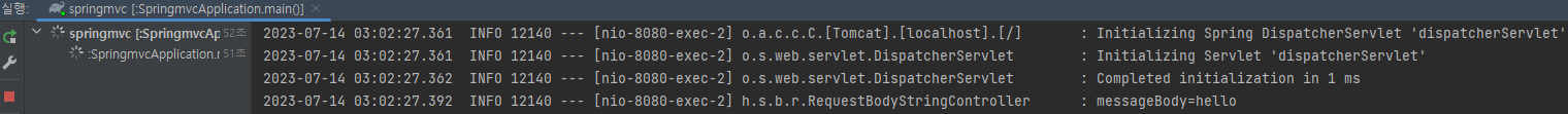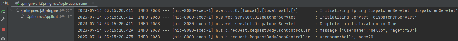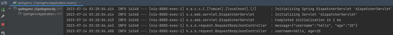 스프링MVC 내부에서 HTTP 메시지 바디를 읽어서 문자나 객체로 변환해서 전달해 주는데, 이때 HTTP 메시지 컨버터(HttpMessageConverter)라는 기능을 사용한다.실행