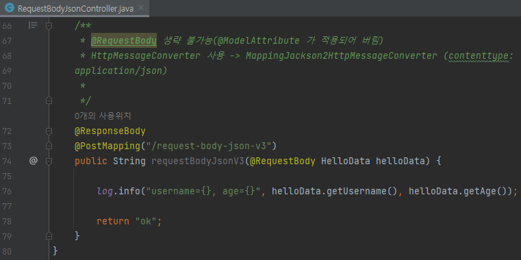 /** * @RequestBody 생략 불가능(@ModelAttribute 가 적용되어 버림) * HttpMessageConverter 사용 -> MappingJackson2HttpMessageConverter (contenttype: application/json) * */ @ResponseBody @PostMapping("/request-body-json-v3") public String requestBodyJsonV3(@RequestBody HelloData helloData) { log.info("username={}, age={}", helloData.getUsername(), helloData.getAge()); return "ok"; }
