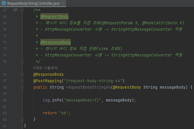 - 이전에 학습했던 @RequestBody를 사용해서 HTTP 메시지에서 데이터를 꺼내고 messageBody에 저장한다.