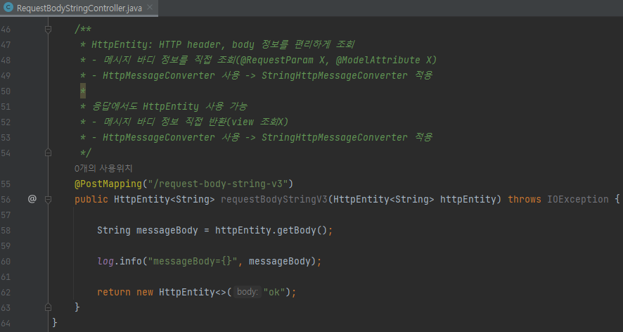 /** * HttpEntity: HTTP header, body 정보를 편리하게 조회 * - 메시지 바디 정보를 직접 조회(@RequestParam X, @ModelAttribute X) * - HttpMessageConverter 사용 -> StringHttpMessageConverter 적용 * * 응답에서도 HttpEntity 사용 가능 * - 메시지 바디 정보 직접 반환(view 조회X) * - HttpMessageConverter 사용 -> StringHttpMessageConverter 적용 */ @PostMapping("/request-body-string-v3") public HttpEntity<String> requestBodyStringV3(HttpEntity<String> httpEntity) throws IOException { String messageBody = httpEntity.getBody(); log.info("messageBody={}", messageBody); return new HttpEntity<>("ok"); }