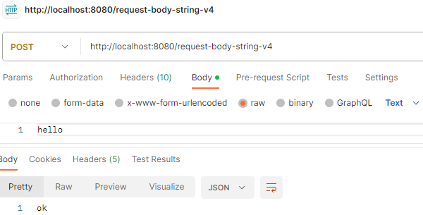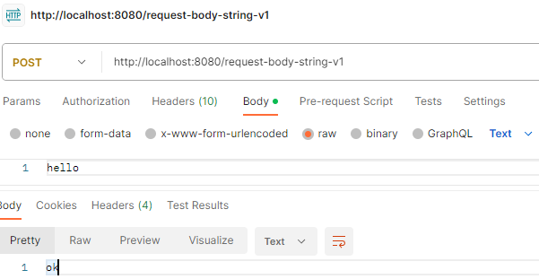 /** * @RequestBody * - 메시지 바디 정보를 직접 조회(@RequestParam X, @ModelAttribute X) * - HttpMessageConverter 사용 -> StringHttpMessageConverter 적용 * * @ResponseBody * - 메시지 바디 정보 직접 반환(view 조회X) * - HttpMessageConverter 사용 -> StringHttpMessageConverter 적용 */ @ResponseBody @PostMapping("/request-body-string-v4") public String requestBodyStringV4(@RequestBody String messageBody) { log.info("messageBody={}", messageBody); return "ok"; }