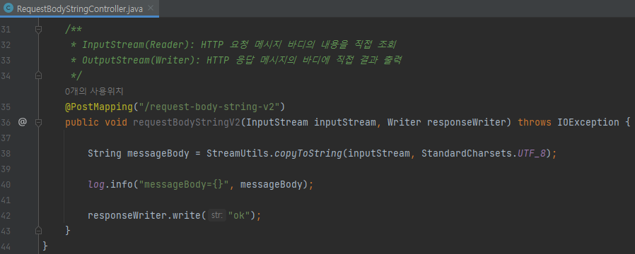 /** * InputStream(Reader): HTTP 요청 메시지 바디의 내용을 직접 조회 * OutputStream(Writer): HTTP 응답 메시지의 바디에 직접 결과 출력 */ @PostMapping("/request-body-string-v2") public void requestBodyStringV2(InputStream inputStream, Writer responseWriter) throws IOException { String messageBody = StreamUtils.copyToString(inputStream, StandardCharsets.UTF_8); log.info("messageBody={}", messageBody); responseWriter.write("ok"); }
