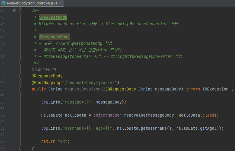 /** * @RequestBody * HttpMessageConverter 사용 -> StringHttpMessageConverter 적용 * * @ResponseBody * - 모든 메서드에 @ResponseBody 적용 * - 메시지 바디 정보 직접 반환(view 조회X) * - HttpMessageConverter 사용 -> StringHttpMessageConverter 적용 */ @ResponseBody @PostMapping("/request-body-json-v2") public String requestBodyJsonV2(@RequestBody String messageBody) throws IOException { log.info("message={}", messageBody); HelloData helloData = objectMapper.readValue(messageBody, HelloData.class); log.info("username={}, age={}", helloData.getUsername(), helloData.getAge()); return "ok"; }