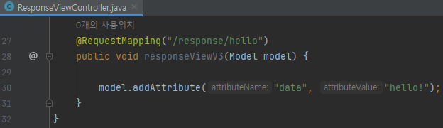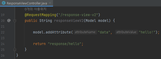 @RequestMapping("/response-view-v2") public String responseViewV2(Model model) { model.addAttribute("data", "hello!"); return "response/hello"; }