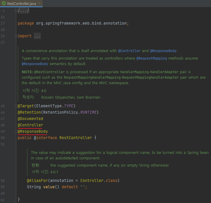 참고로 @ResponseBody는 클래스 레벨에 두면 전체 메서드에 적용되는데, @RestController 에노테이션 안에 @ResponseBody가 적용되어 있다.