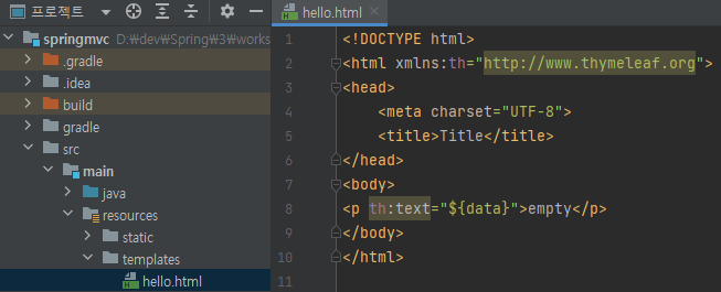 <!DOCTYPE html> <html xmlns:th="http://www.thymeleaf.org"> <head> <meta charset="UTF-8"> <title>Title</title> </head> <body> <p th:text="${data}">empty</p> </body> </html>