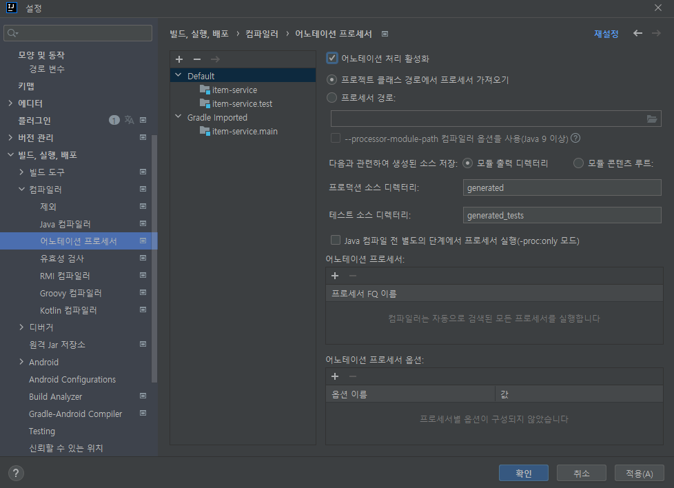 설정 -> 어노테이션 프로세서 -> 어노테이션 처리 활성화 체크