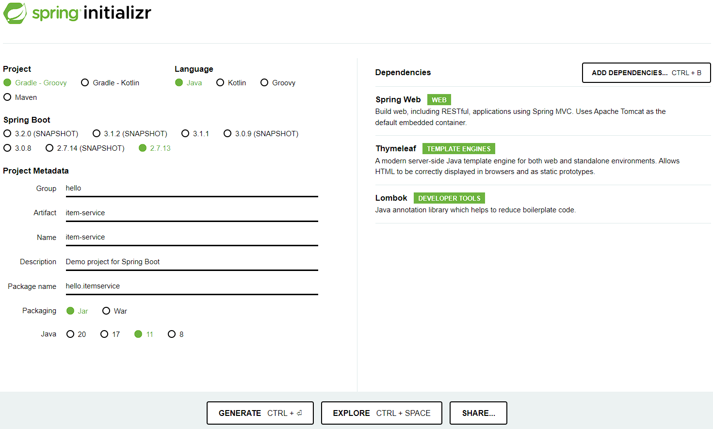 - Dependencies : Spring Web, Thymeleaf, Lombok