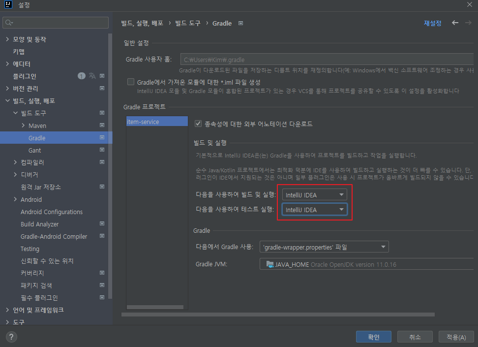 설정 -> Gradle -> Intelij IDEA로 변경