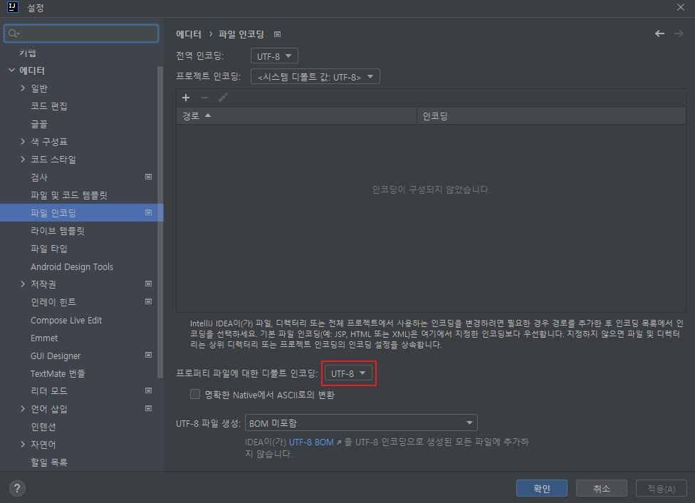 설정 -> 파일 인코딩 -> 프로퍼티 파일에 대한 디폴트 인코딩을 UTF-8로 변경