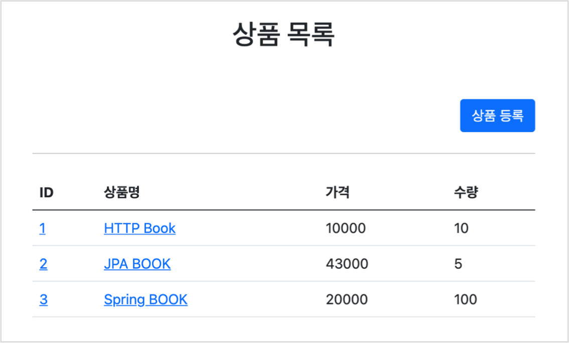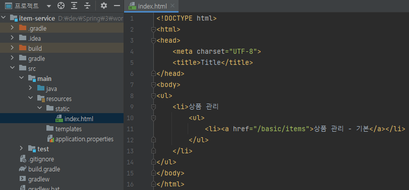 <!DOCTYPE html> <html> <head> <meta charset="UTF-8"> <title>Title</title> </head> <body> <ul> <li>상품 관리 <ul> <li><a href="/basic/items">상품 관리 - 기본</a></li> </ul> </li> </ul> </body> </html>