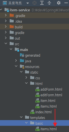 resources/static/html/items.html을 resources/templates/basic로 복붙
