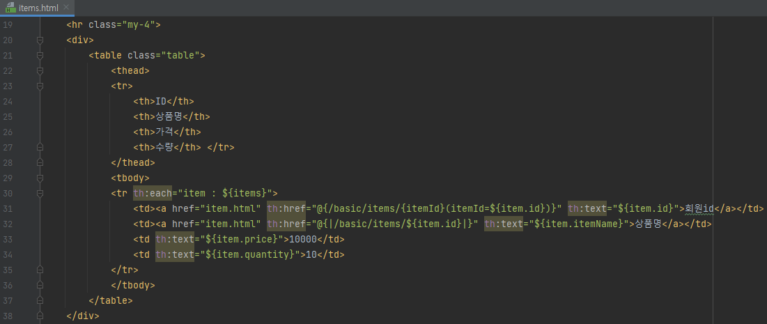 - 반복은 th:each를 사용한다. 이렇게 하면 모델에 포함된 items 컬렉션 데이터가 item 변수에 하나씩 포함되고, 반복문 안에서 item 변수를 사용할 수 있다.