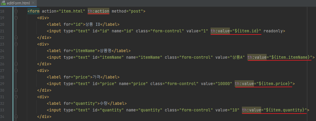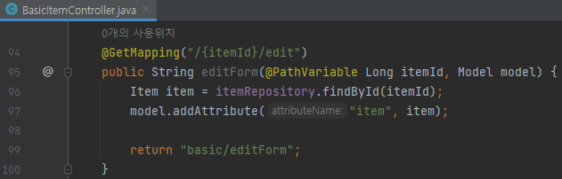 @GetMapping("/{itemId}/edit") public String editForm(@PathVariable Long itemId, Model model) { Item item = itemRepository.findById(itemId); model.addAttribute("item", item); return "basic/editForm"; }