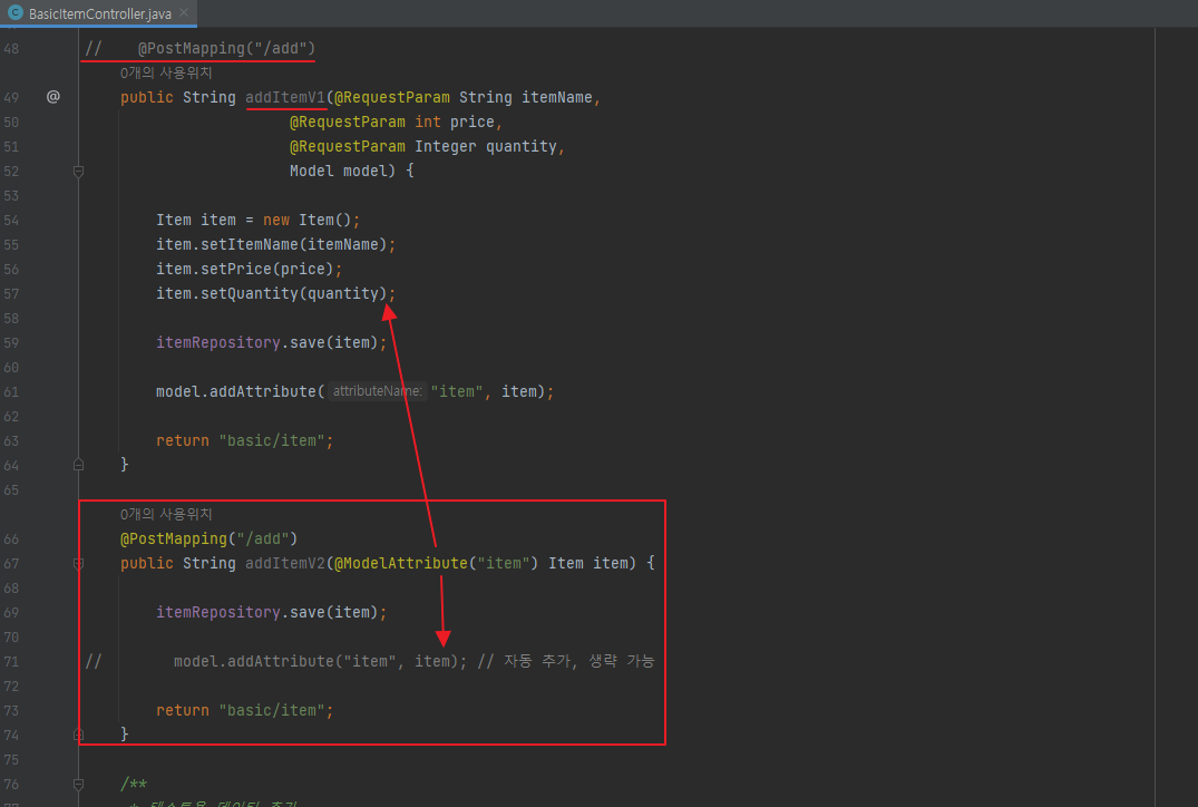 // @PostMapping("/add") public String addItemV1(@RequestParam String itemName, @RequestParam int price, @RequestParam Integer quantity, Model model) { Item item = new Item(); item.setItemName(itemName); item.setPrice(price); item.setQuantity(quantity); itemRepository.save(item); model.addAttribute("item", item); return "basic/item"; } @PostMapping("/add") public String addItemV2(@ModelAttribute("item") Item item) { itemRepository.save(item); // model.addAttribute("item", item); // 자동 추가, 생략 가능 return "basic/item"; }