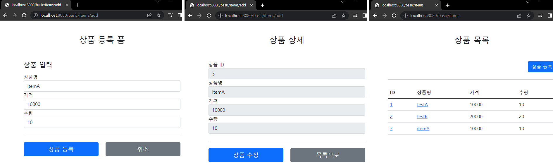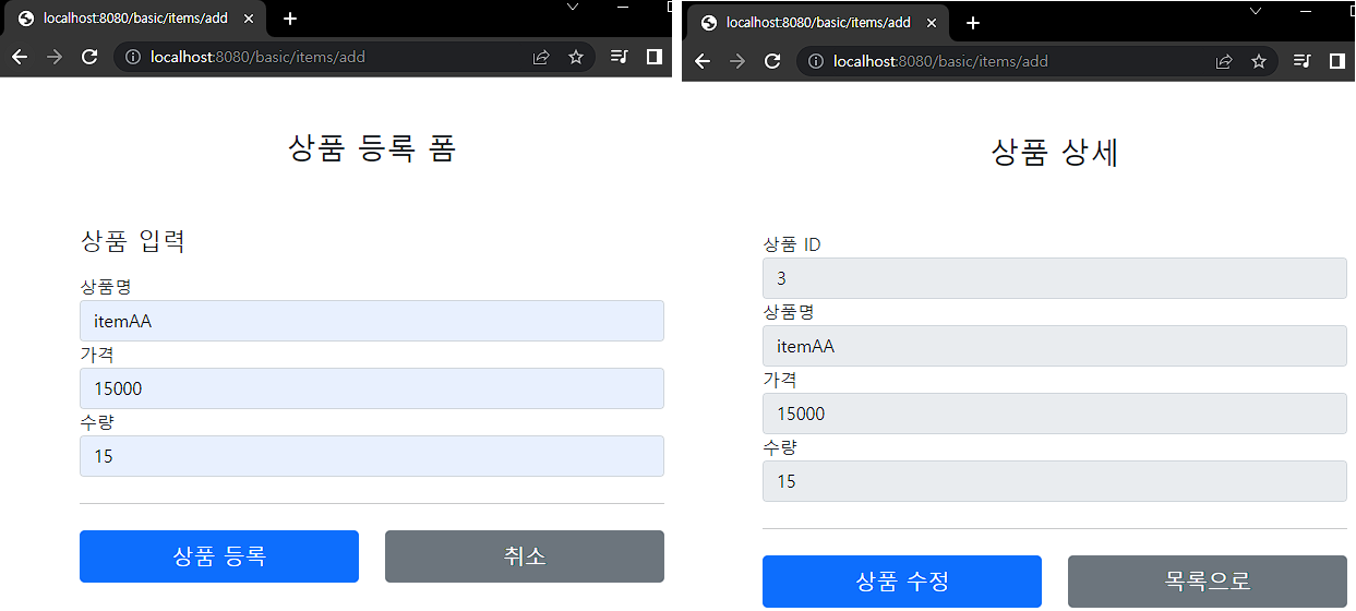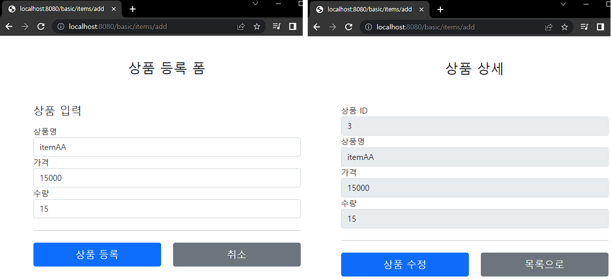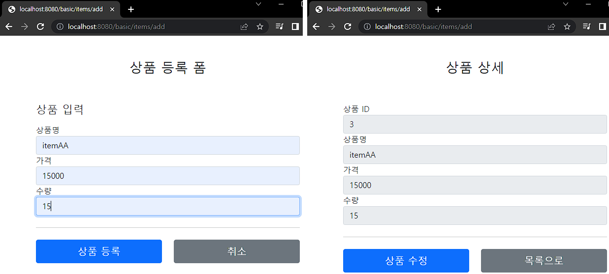 실행전에 이전 버전인 addItemV1에 @PostMapping("/add")를 꼭 주석처리 해주어야 한다. 그렇지 않으면 중복 매핑으로 오류가 발생한다.