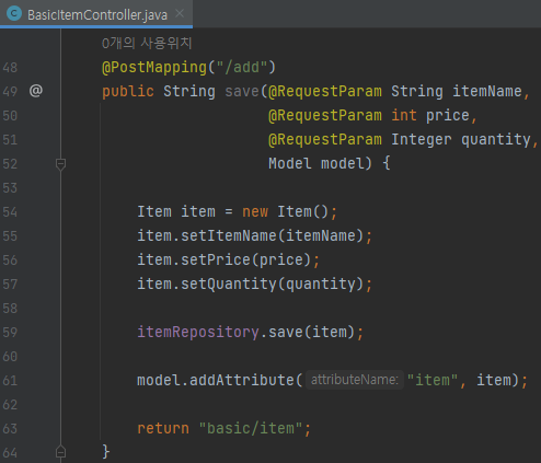 @PostMapping("/add") public String save(@RequestParam String itemName, @RequestParam int price, @RequestParam Integer quantity, Model model) { Item item = new Item(); item.setItemName(itemName); item.setPrice(price); item.setQuantity(quantity); itemRepository.save(item); model.addAttribute("item", item); return "basic/item"; }