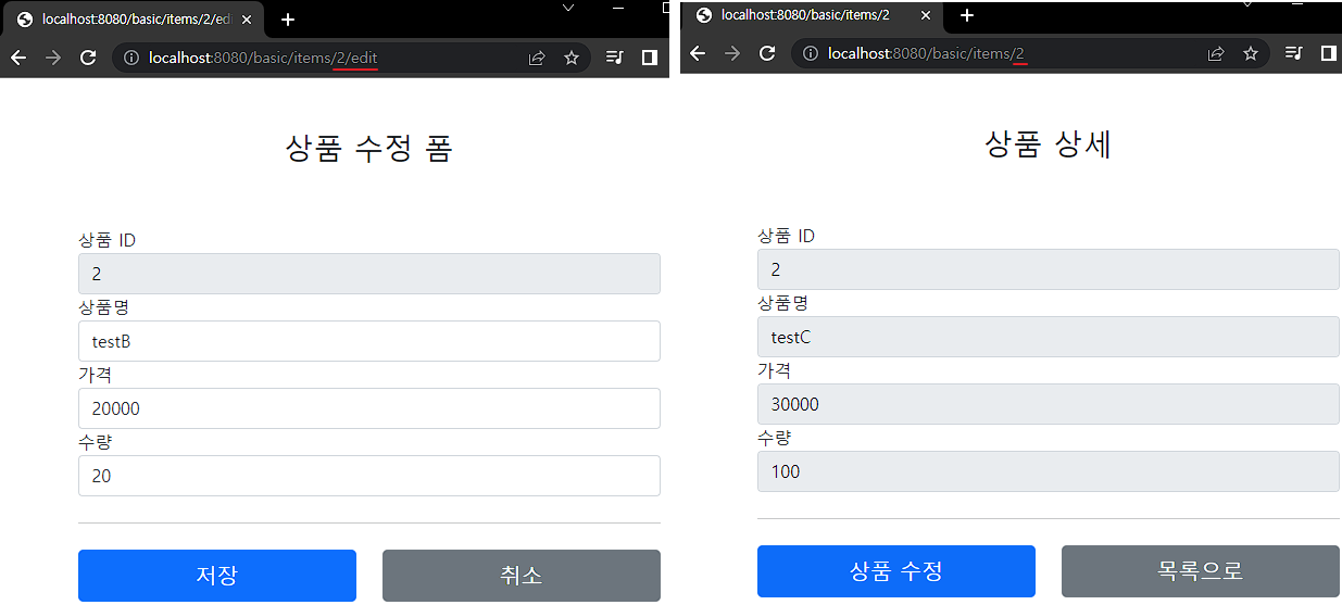 상품 수정은 마지막에 뷰 템플릿을 호출하는 대신에 상품 상세 화면으로 이동하도록 리다이렉트를 호출한다.