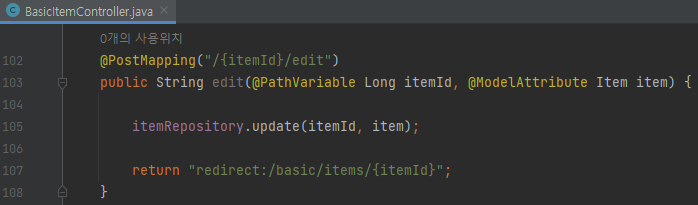 - redirect:/basic/items/{itemId} {itemId}는 @PathVariable Long itemId의 값을 그대로 사용한다.